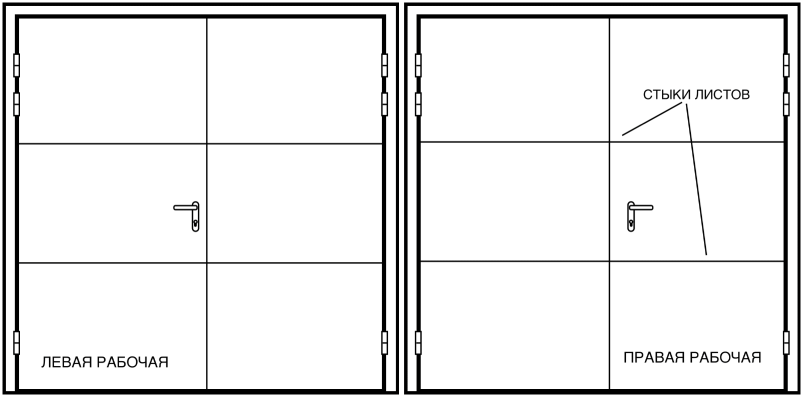 Ворота распашные (3,0 мм+1,4 мм рекомендовано при размерах более 3*3 м) противопожарные Ei60 / технические двупольные равнопольные: короб закрытого типа усиленный из сложно гнутого профиля из стали З мм, с / без порога, короб угловой с наличником по 50 мм / торцевой / разборный (при необходимости делаем по умолчанию). Полотна коробчатого типа (типа «СЭНДВИЧ») из стали 1,4 мм с наполнением базальтовой плитой 60-80 мм и усилением по периметру профилем, петли капли 160*25 мм по З шт. на полотно. Замок «Страж» с черной ручкой на планке на рабочей створке, не рабочая створка на шпингалетах (при необходимости ставим гаражные задвижки по умолчанию). Уплотнение по периметру (Е+Д), термолента (если Ei60). Ral стандарт шагрень, открывание только наружу.
